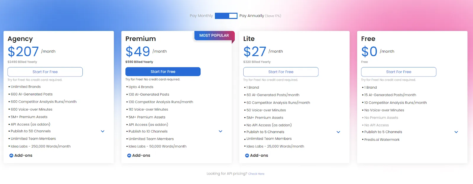 - Starter Plan: $39/month when billed annually, which gives you access to 100 performance predictions, 50 performance data rows, and 1 brand voice.