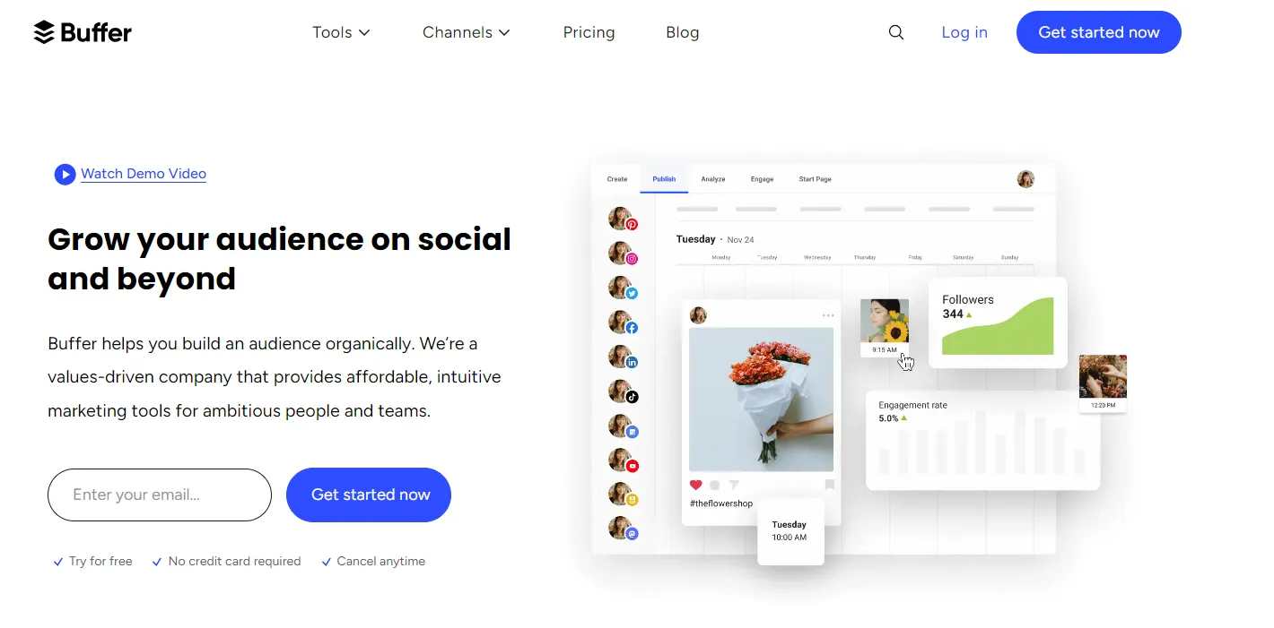 Buffer has a free plan that lets you connect with up to 3 channels and gives you access to the tool’s landing page builder and AI assistant.