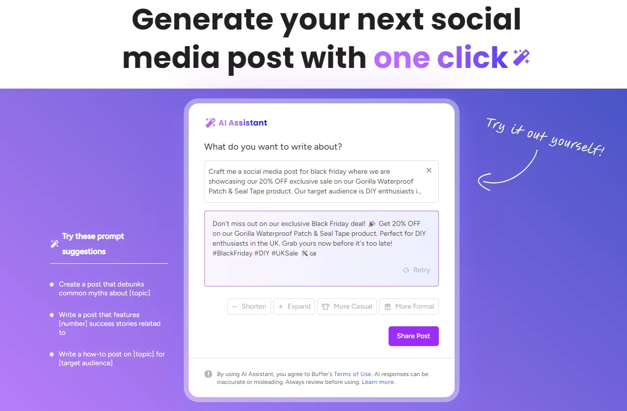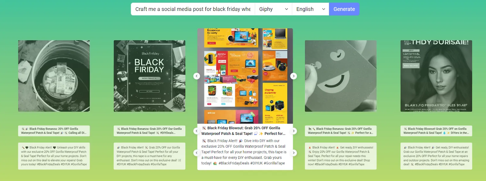 💡 I found that the online post generator available on their website (from the screenshot above) can create up to 5 social posts per day for free.