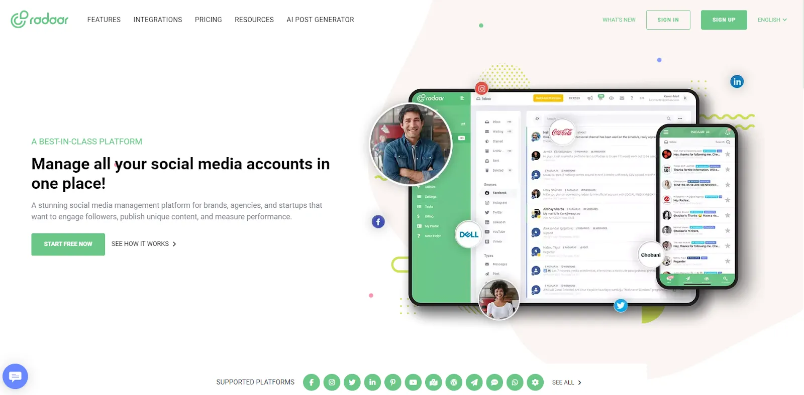 Radaar is a social media marketing platform that offers a free social post generator which helps you generate posts in different languages.