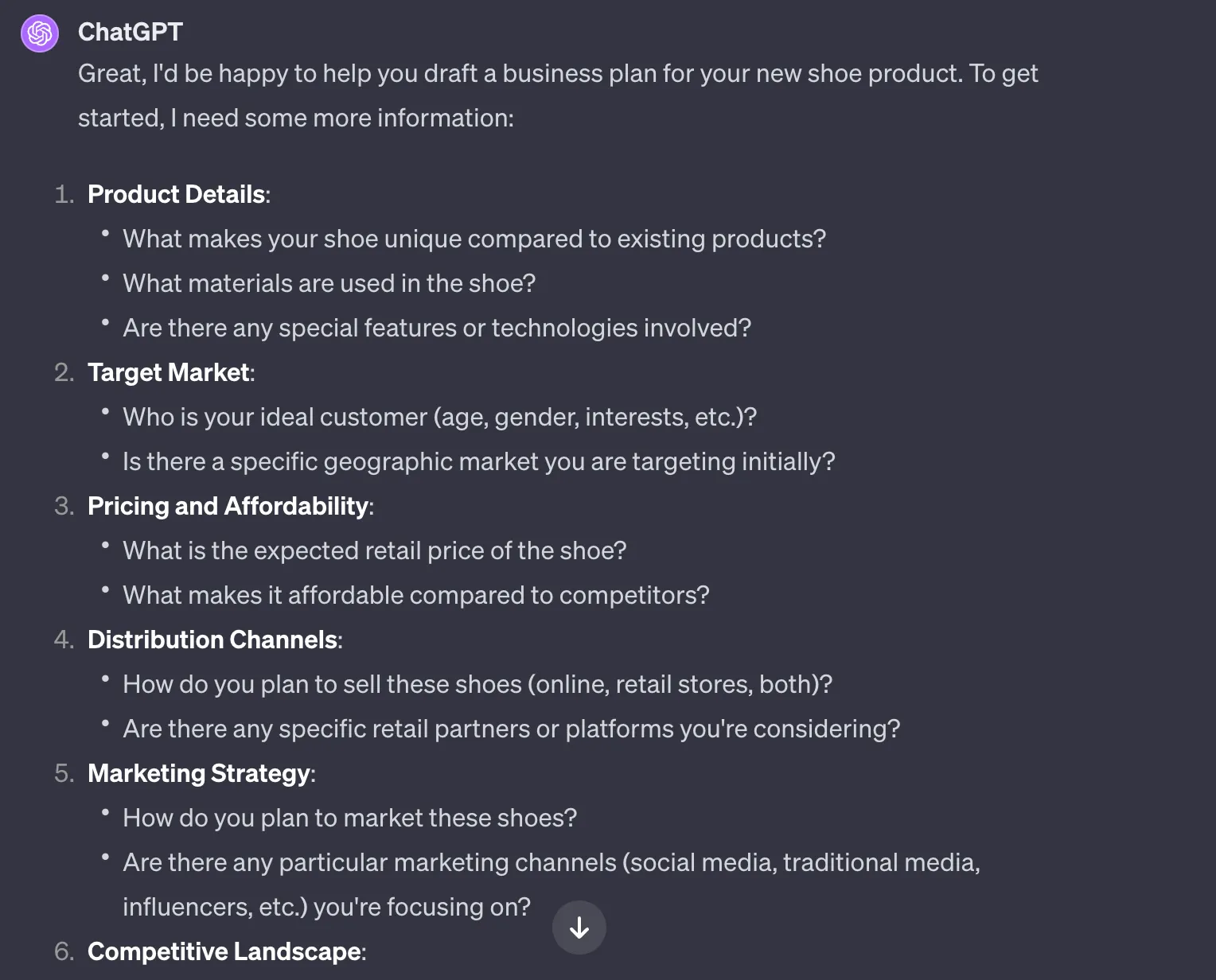 Context: The product is a new type of shoe that is flexible and affordable. Ask me all the clarifying questions you need to understand the product and target market thoroughly. I will answer them for you.