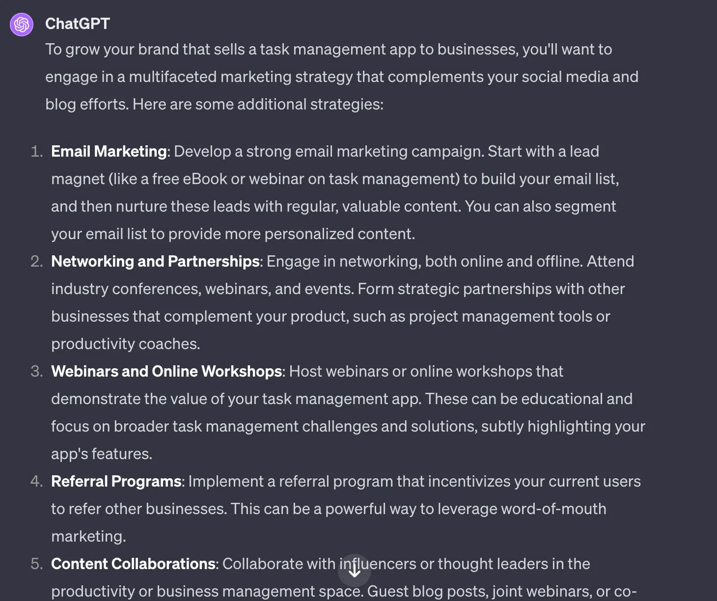 Follow-up prompt: What do you think I should do apart from posting on social media and growing a blog to Grow my brand that sells a task management app to businesses?