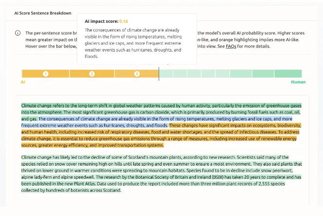 GPTZero’s most powerful feature is its AI Detector, which scans any document and identifies segments written by an AI engine.