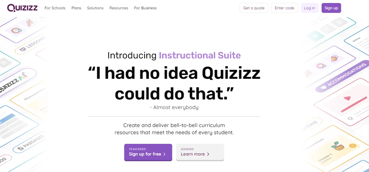 7. Quizizz– Good for AI-generated interactive quizzes, lessons, and other student learning resources.