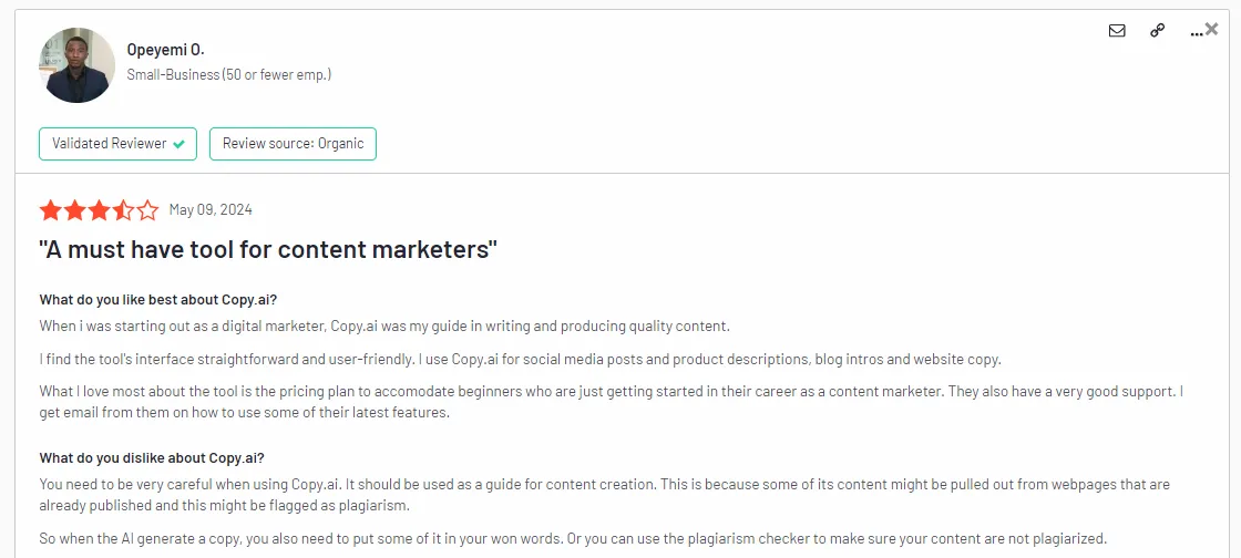 Moreover, Copy.ai does not have built-in plagiarism checkers, meaning you’ll have to be extra careful with the content it creates, or you risk being flagged for spam.