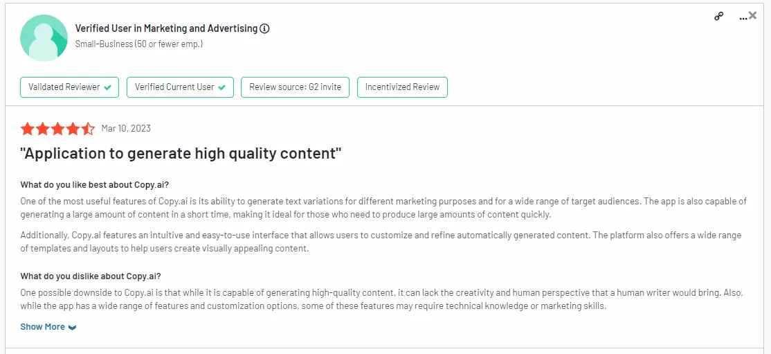 While Copy.ai can help you create content much faster than manually, its content lacks the obvious – the human touch.