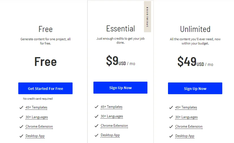 - Unlimited: $7.50/m, unlimited copy, 1 personalized tone of voice, 50/m plagiarism checks.