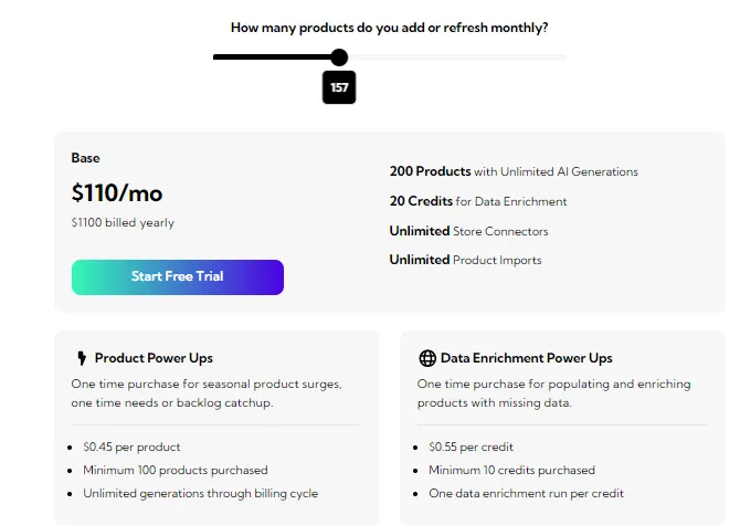 The pricing starts at $28 per month for up to 50 products and includes 5 data enrichment credits and can go up to $250 per month for up to 450 products and 45 credits.