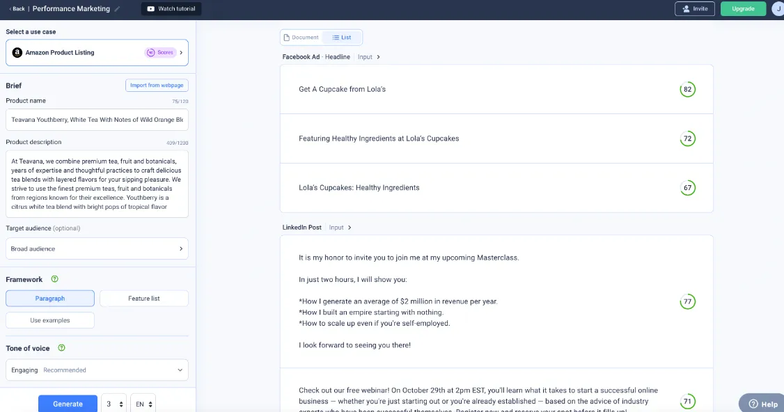 This makes it a great choice for e-commerce businesses and retailers needing fast and optimized product descriptions, ad copy, and product-focused social content.
