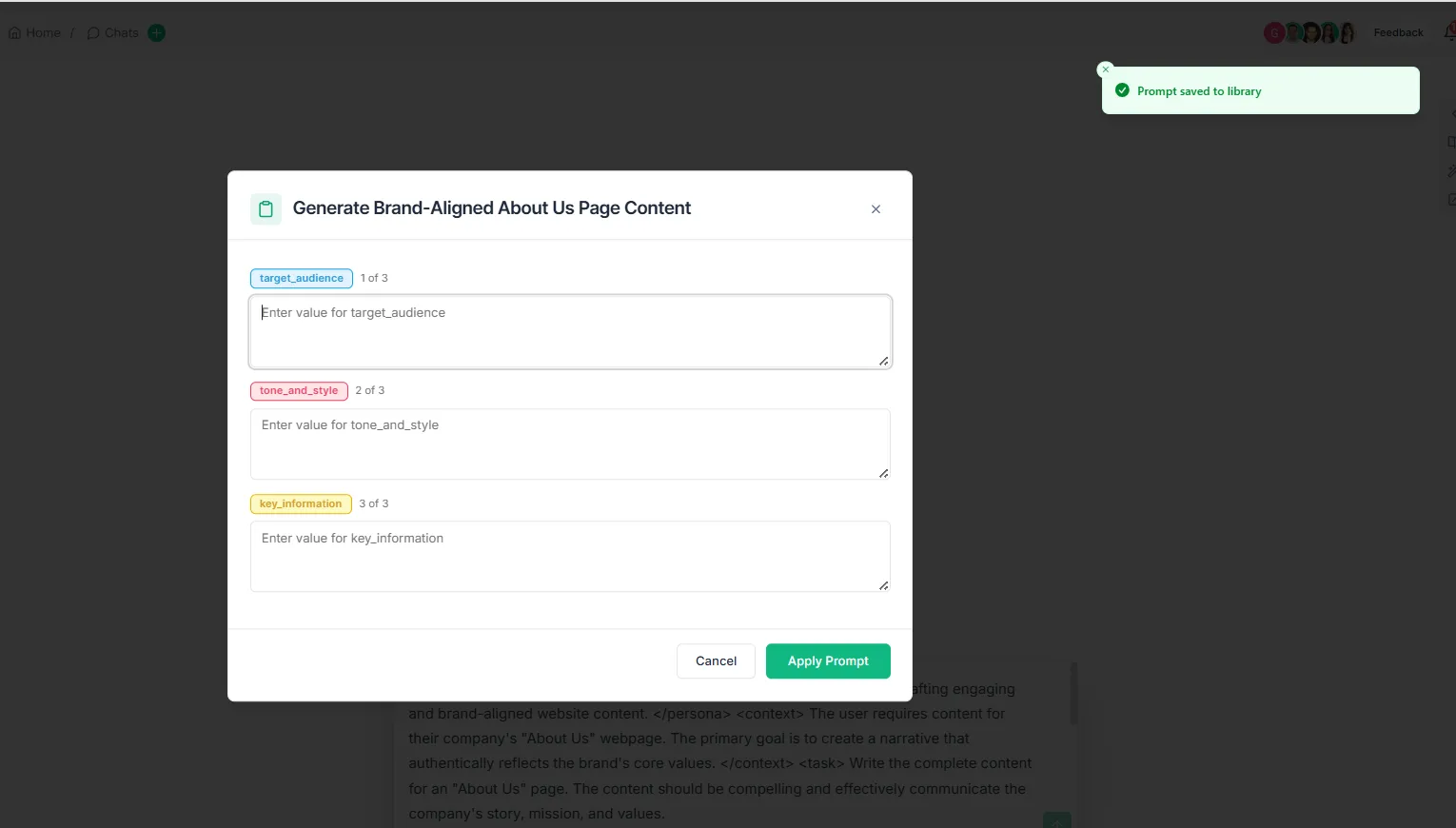 - Being able to collaborate with your team on the about us page generation so you can learn from prompts from one another and save your best prompts.