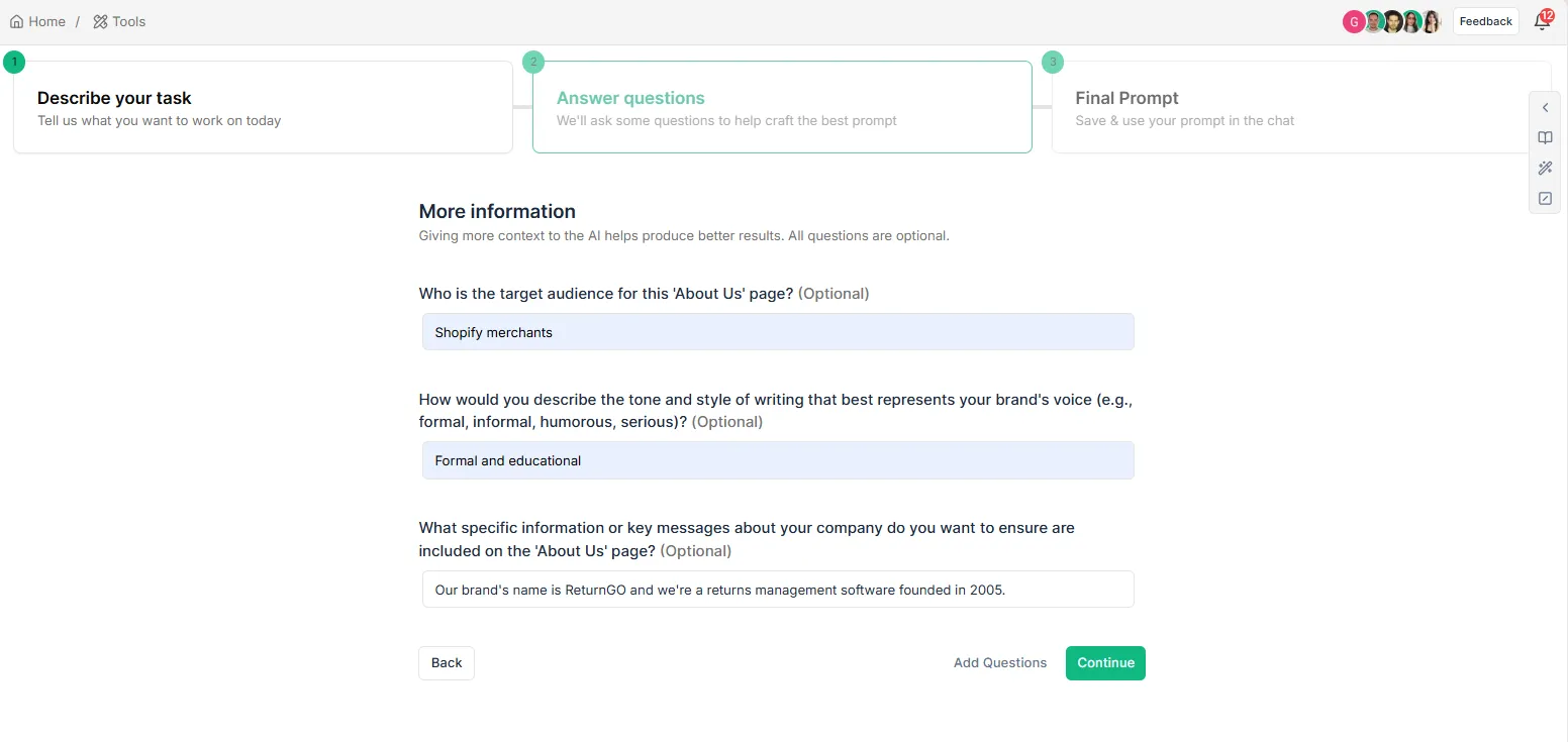 After that, our prompt builder will ask you to answer a few follow-up questions about the about us page that you are looking to generate.