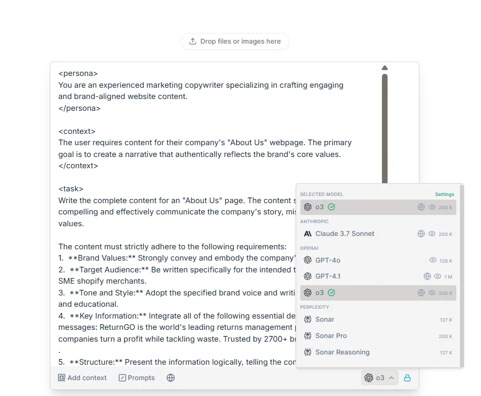 Our collaborative AI platform lets you choose the AI model that you want to use for the output, such as ChatGPT’s o3 model.