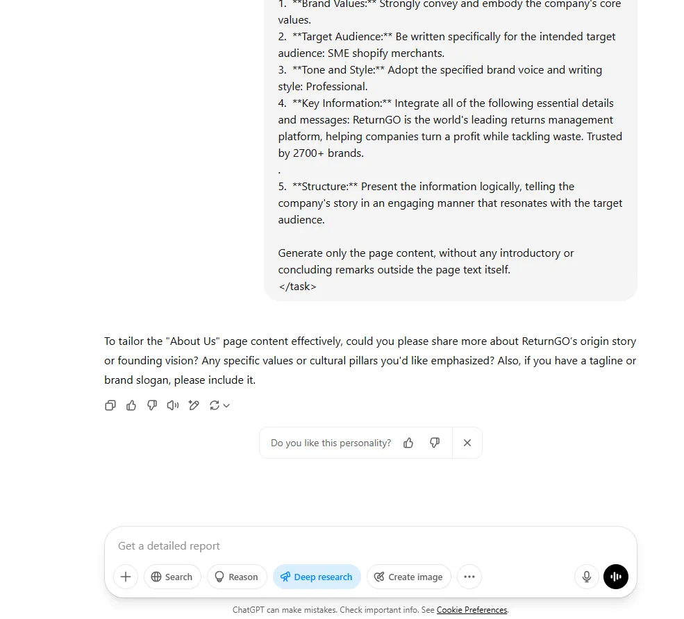 ➡️ This includes assessing whether the tool has taken into consideration the provided information and has generated an on-brand version of your about us page.