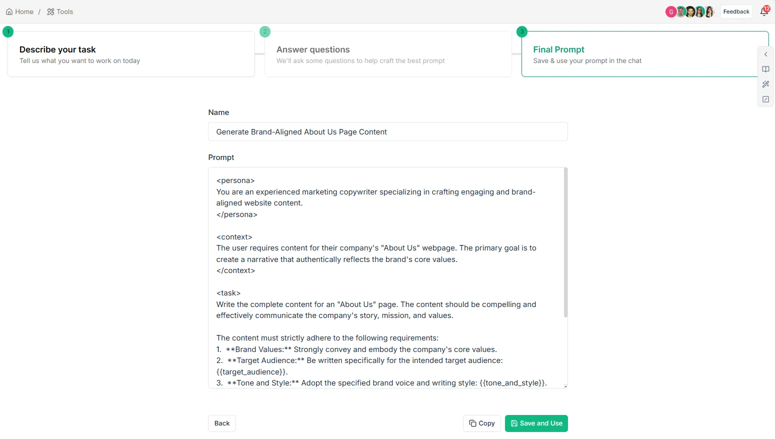 - A prompt builder, which will help you refine your about us page generation prompt to fit with your content.