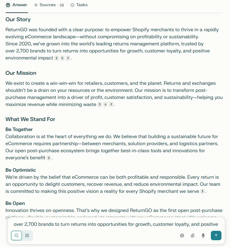 Perplexity is an AI model where you can generate ‘’About Us’’ pages at scale by prompting the tool and telling it how to produce them.