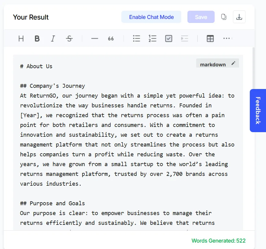 The tool generated a 522-word-long About Us page that goes over my company’s journey and then dives into purpose and goals.