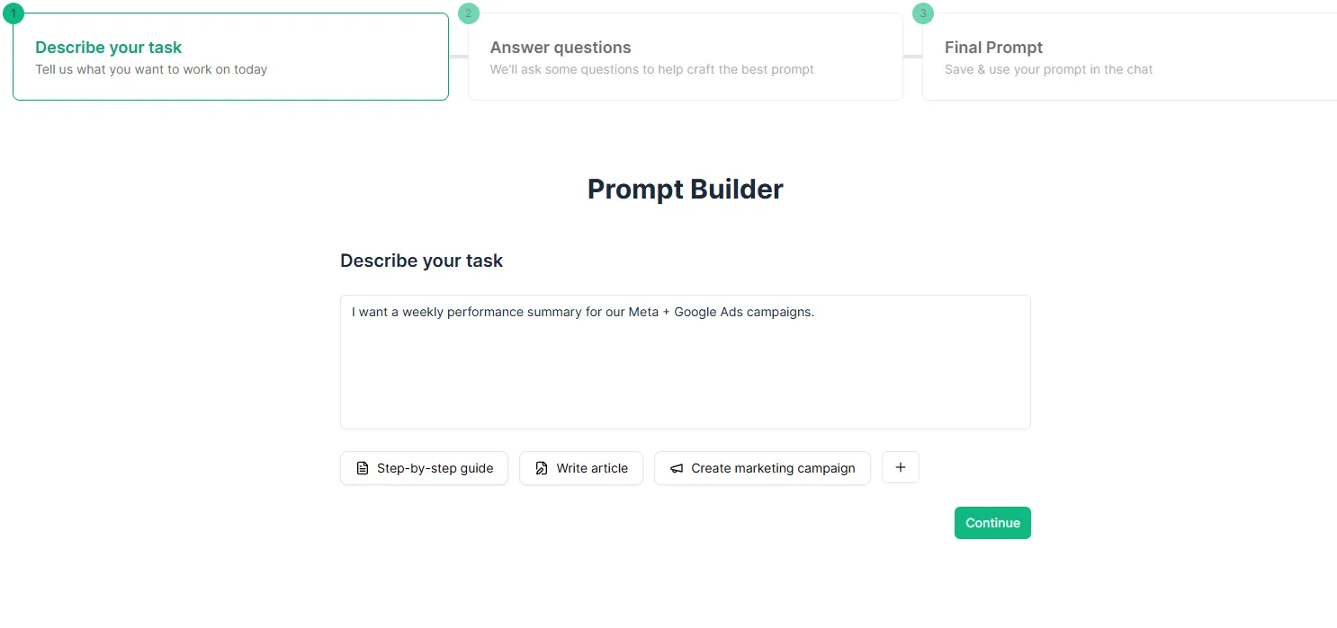 Here’s a step-by-step demo on how to build a prompt that will help you create comprehensive reports for your ads: How to use the Prompt Builder | Team-GPT.