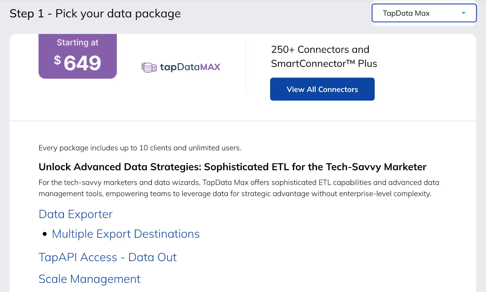 - Starter Plan — Custom pricing. Includes access to top connectors and marketing data modeling.