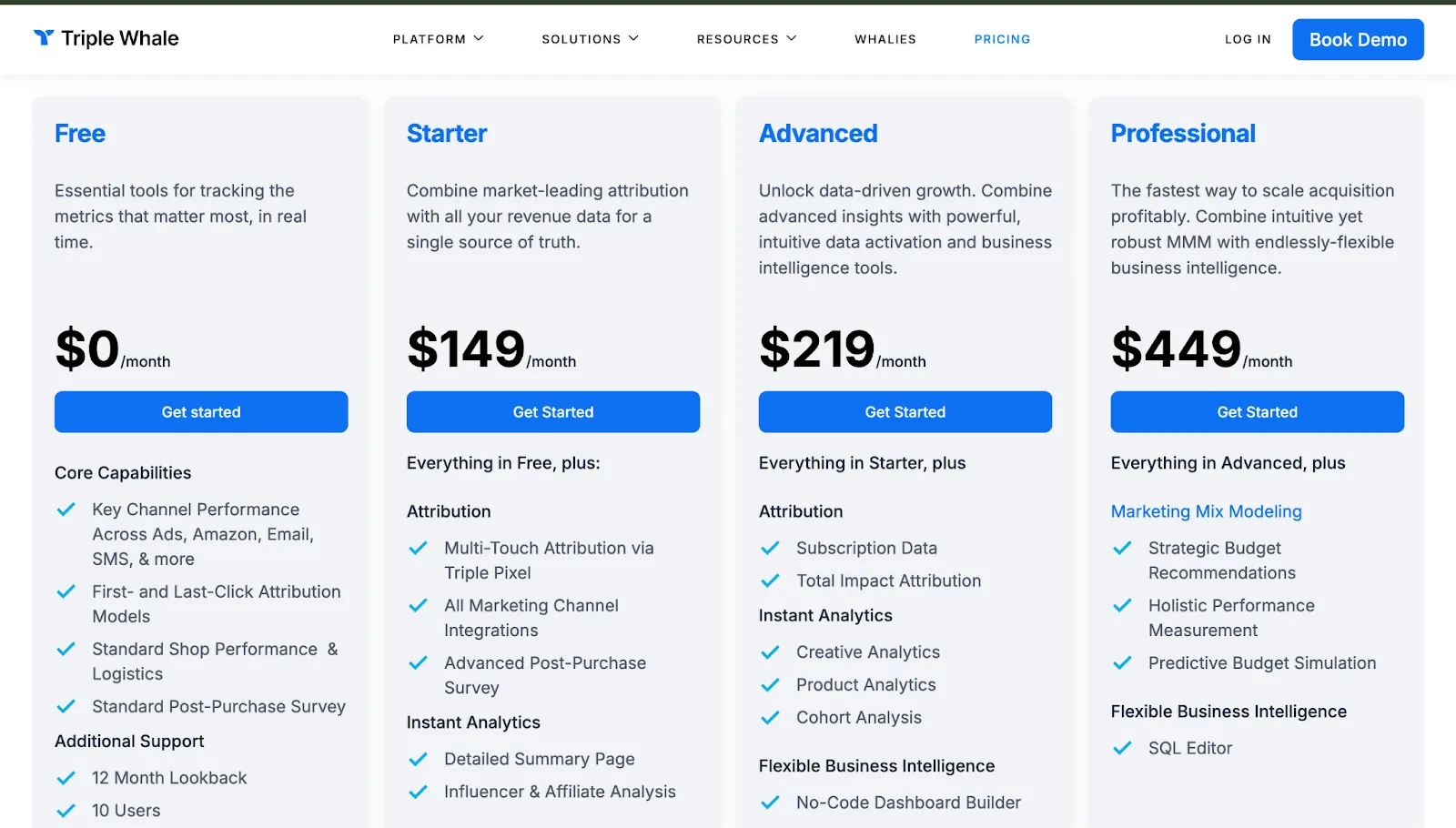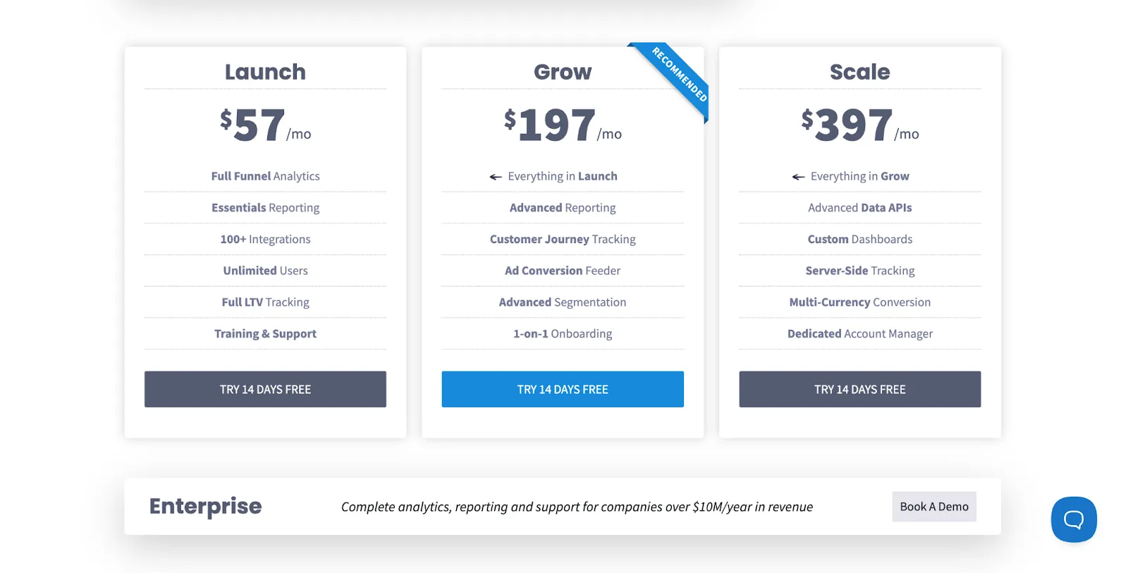 - Scale Plan — $397/month. Includes everything in the Grow Plan plus advanced data APIs, custom dashboards, server-side tracking, multi-currency conversion, and a dedicated account manager.