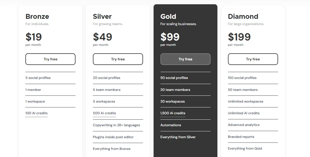 - Silver: $49/month, which includes 20 social profiles, 5 workspaces, 5 members, 500 AI credits, and more.