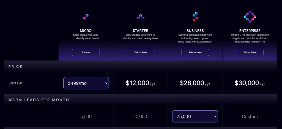 - Enterprise: Starts at $30,000/year, lets you identify a custom number of visitors, includes everything in Business, plus custom signals and warm calling.