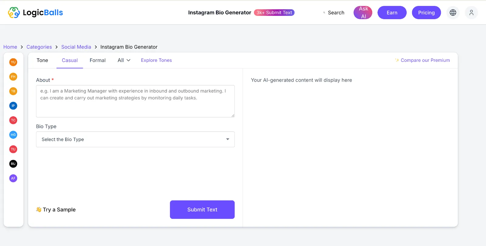 If you want to create short, sharp bios for social platforms like Instagram, LinkedIn, Twitter, or Pinterest, LogicBalls is one of the fastest tools to get started.