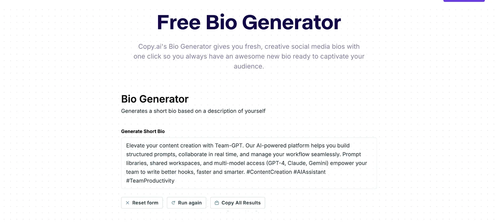 The first and the best AI bio generator in my experience is Team-GPT. And I’m saying this after experimenting with 30+ tools.