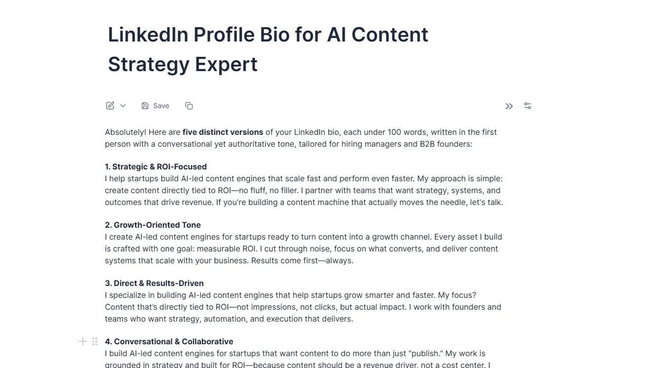 “I want a 100-word LinkedIn bio written in first person that feels conversational and authoritative. The audience is hiring managers and B2B founders. Include what I do (AI-led content engines for startups) and what drives me (creating content DIRECTLY tied to ROI).”