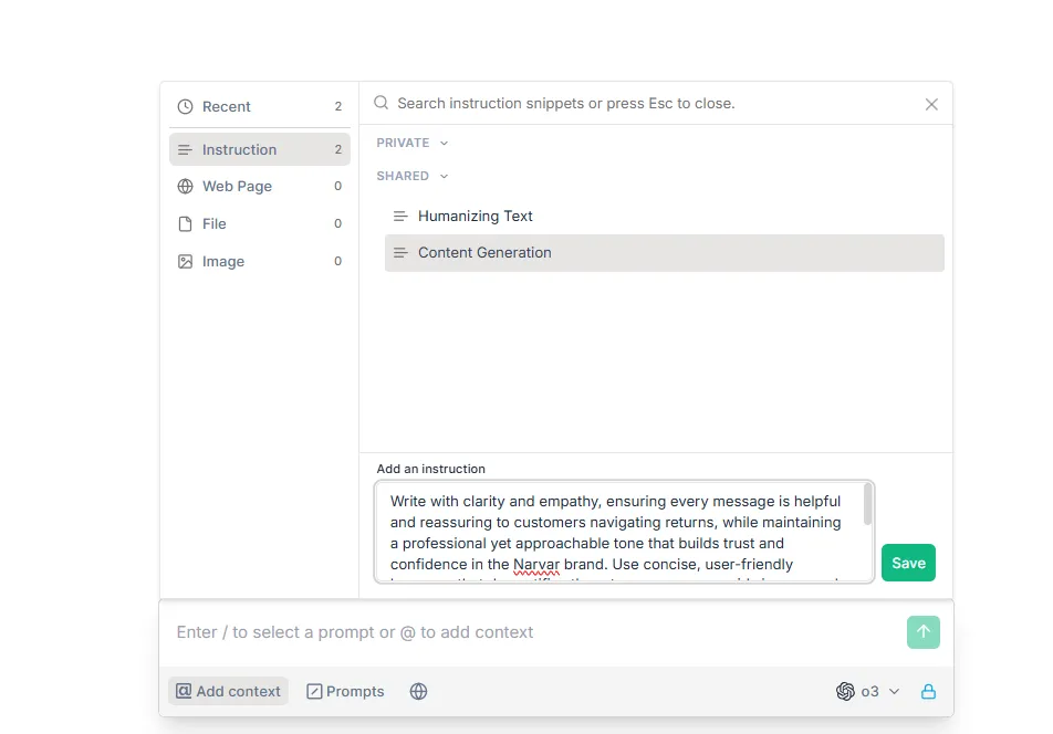 After that, you’ll be able to see ‘’Instruction’’ on top (where you will be able to see your private and shared custom instructions) and add your brand’s instructions.