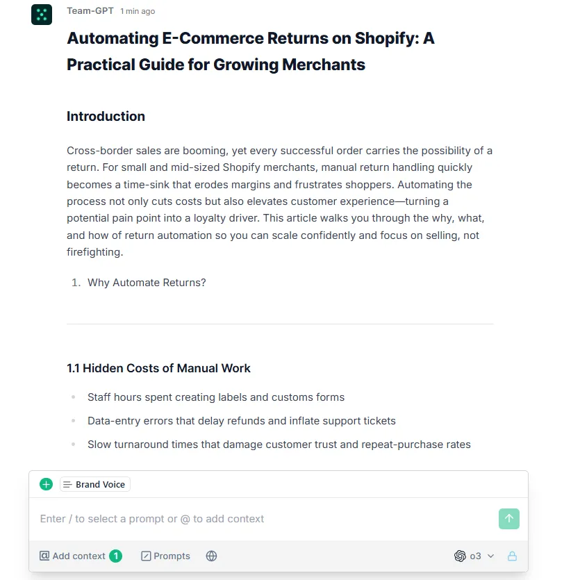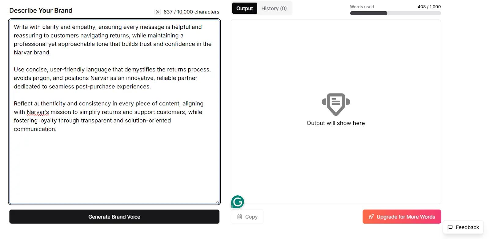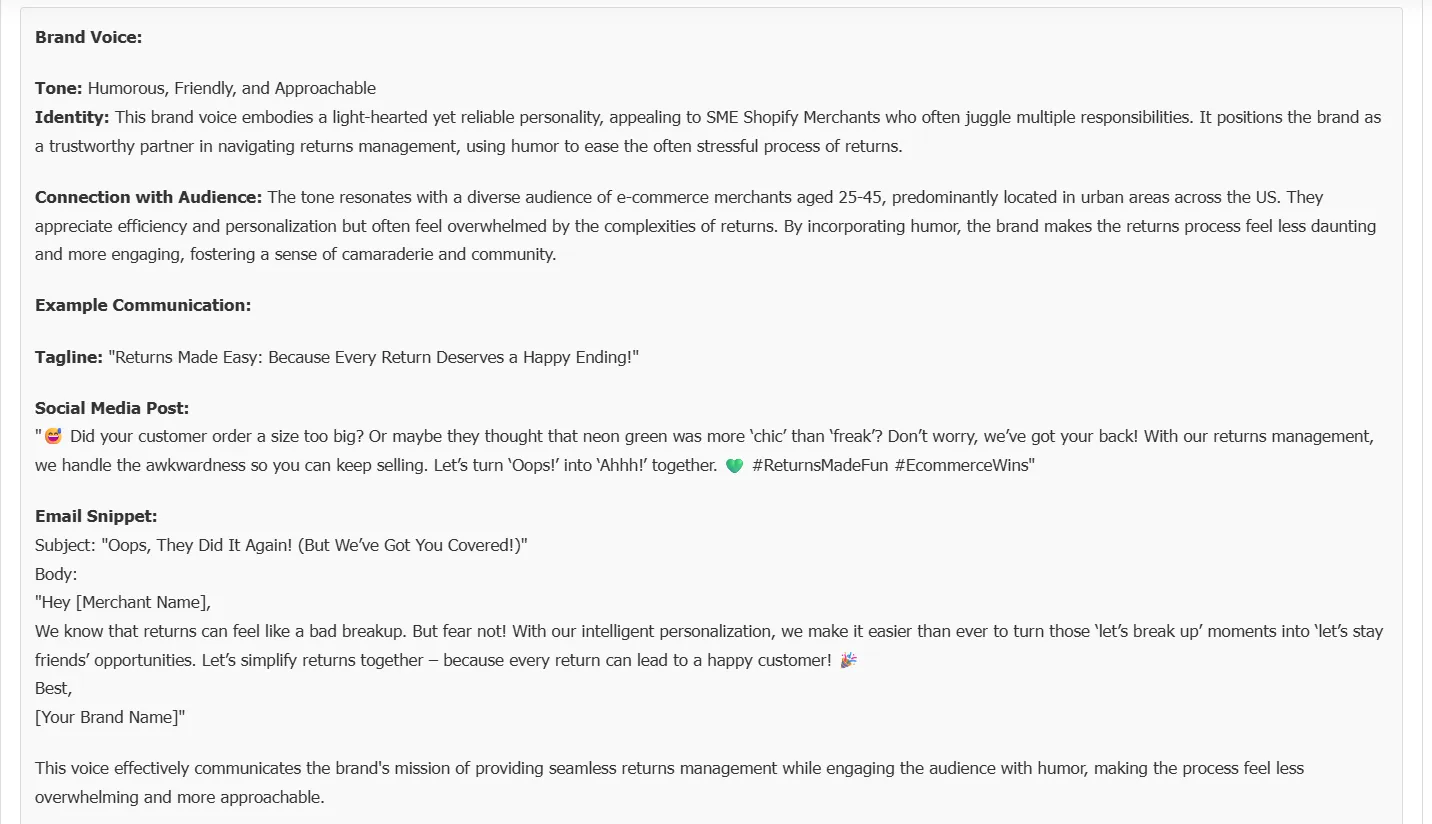 The tool created a 300-word explanation of my brand, positioning it as a leader in the e-commerce returns management space.