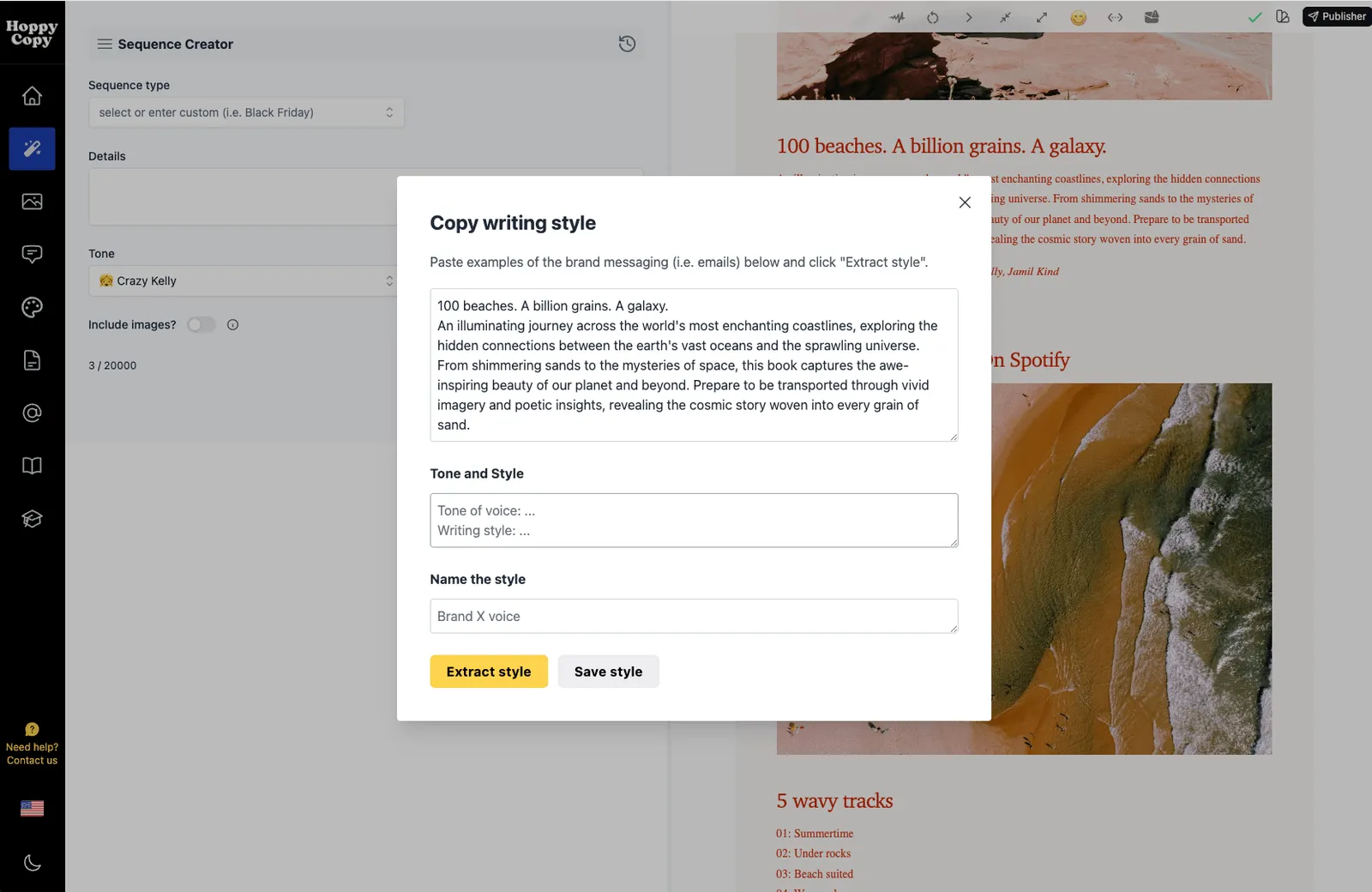 Hoppy Copy offers an AI brand voice generator, where it asks you about your brand’s: