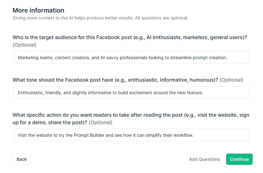 Once I answer everything, it builds a clear, structured prompt that reflects what I want the post to do, not just what the topic is.