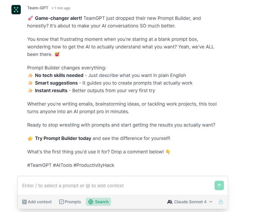 What I like most about Team-GPT is that it helps me build the thinking behind it. Unlike other generators that just reword the topic, this one lets me shape the prompt fully—tone, audience, post intent, context—and then choose which AI model I want to generate the post with.