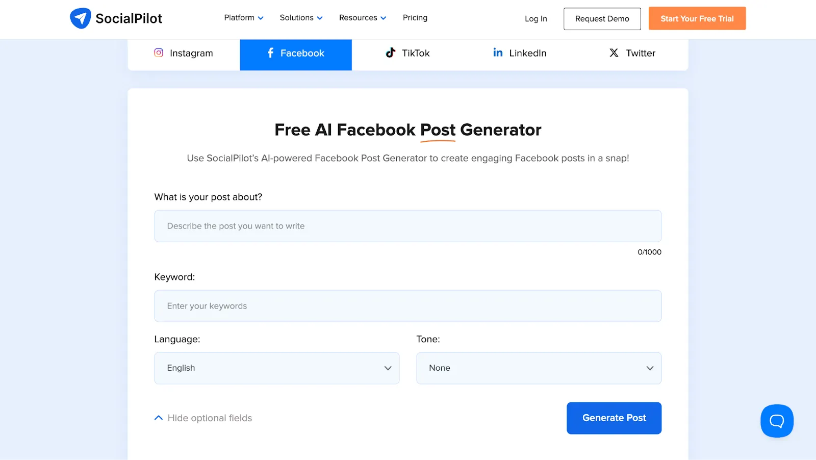 SocialPilot’s Facebook Post Generator is a quick and reliable tool for writing Facebook captions that match your brand voice. You can generate short posts by describing your topic, picking a tone, and adding keywords. The tool provides scroll-worthy content with emojis and hashtags already included.