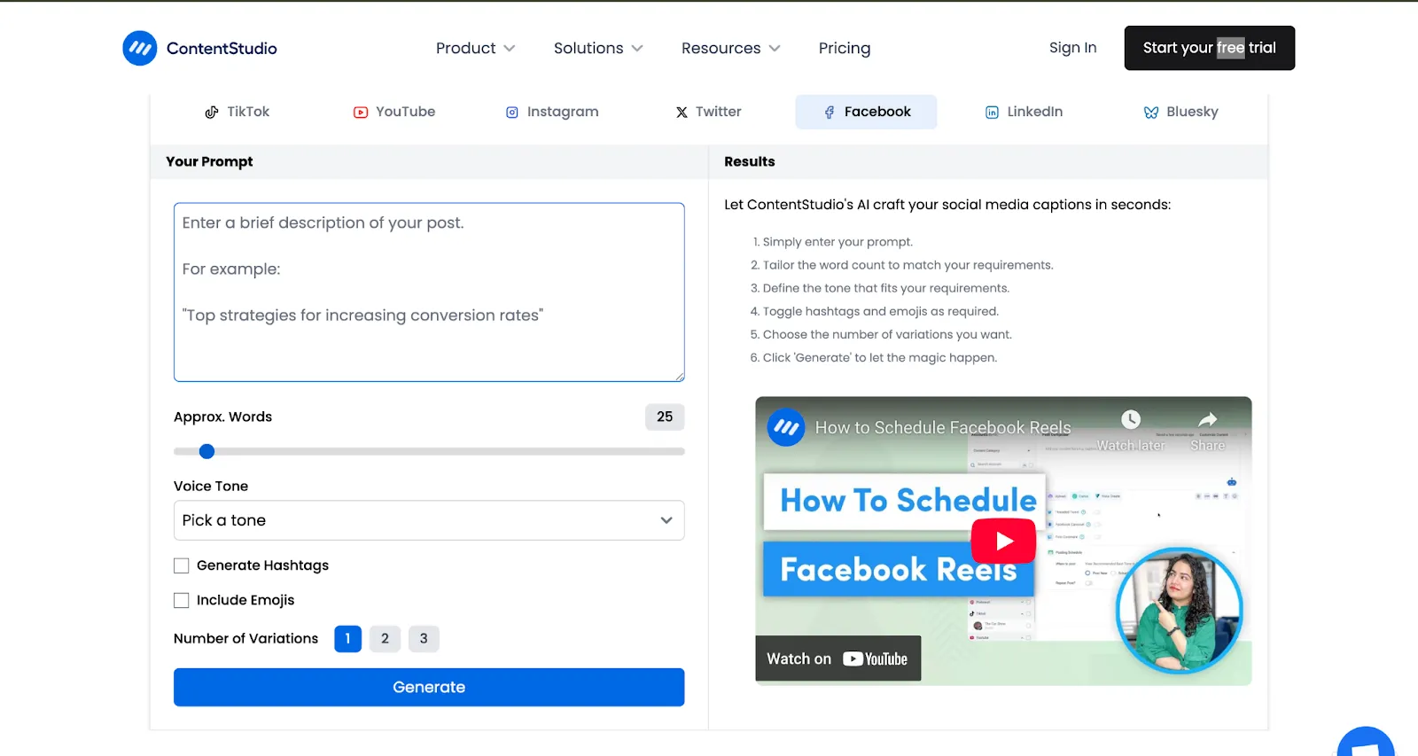 ContentStudio’s Facebook Post Generator is part of a wider platform built for content creation, scheduling, and reporting. If you’re looking for quick captions with customization options, such as tone, word count, emojis, and hashtags, this tool is a solid choice. You just enter your prompt, adjust the tone and length, and get multiple variations in seconds.
