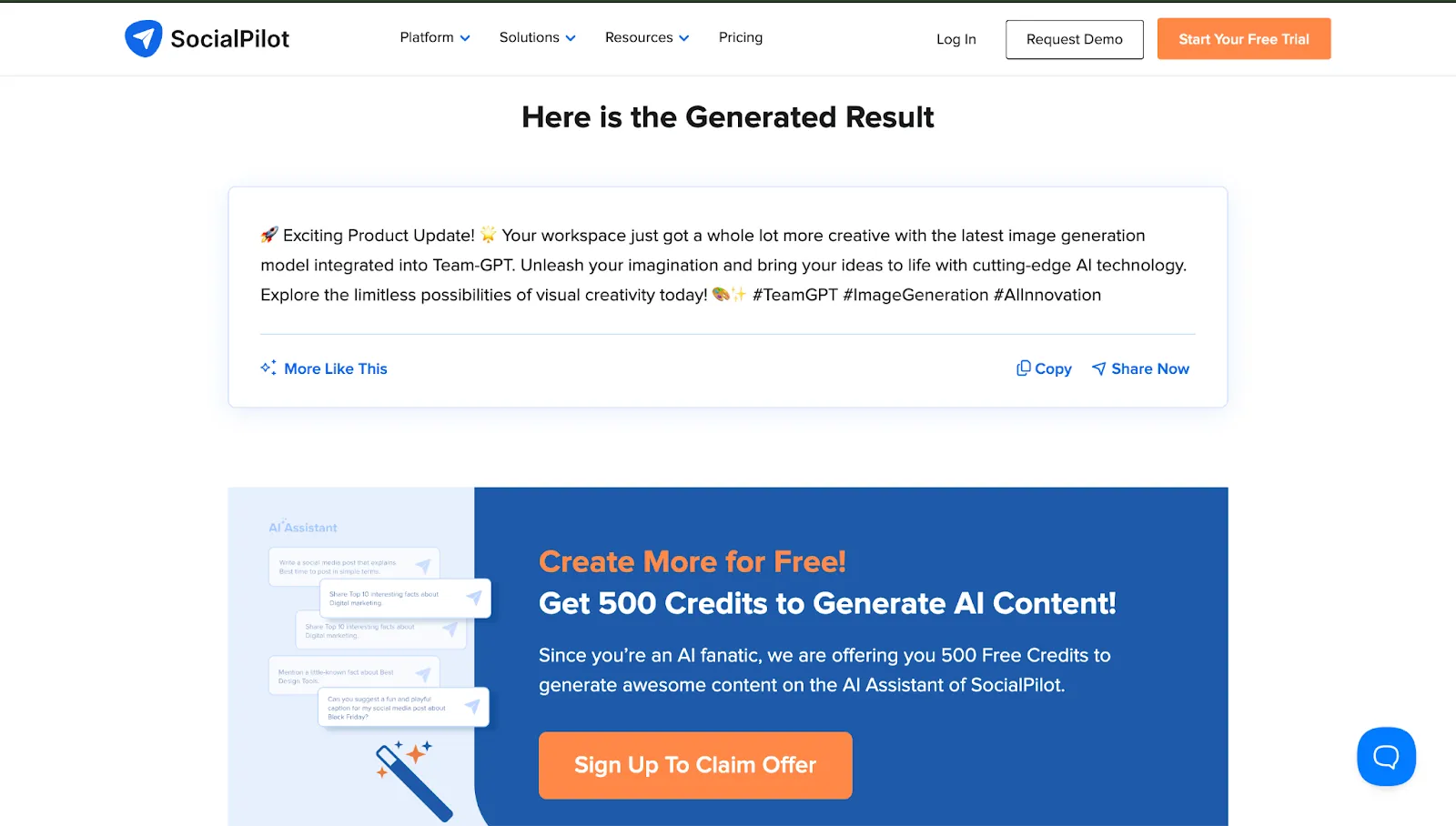 To see if it’s really worth the hype, I asked SocialPilot to generate a Facebook post about Team-GPT’s new product update on advanced image generation. Here’s what it gave me: