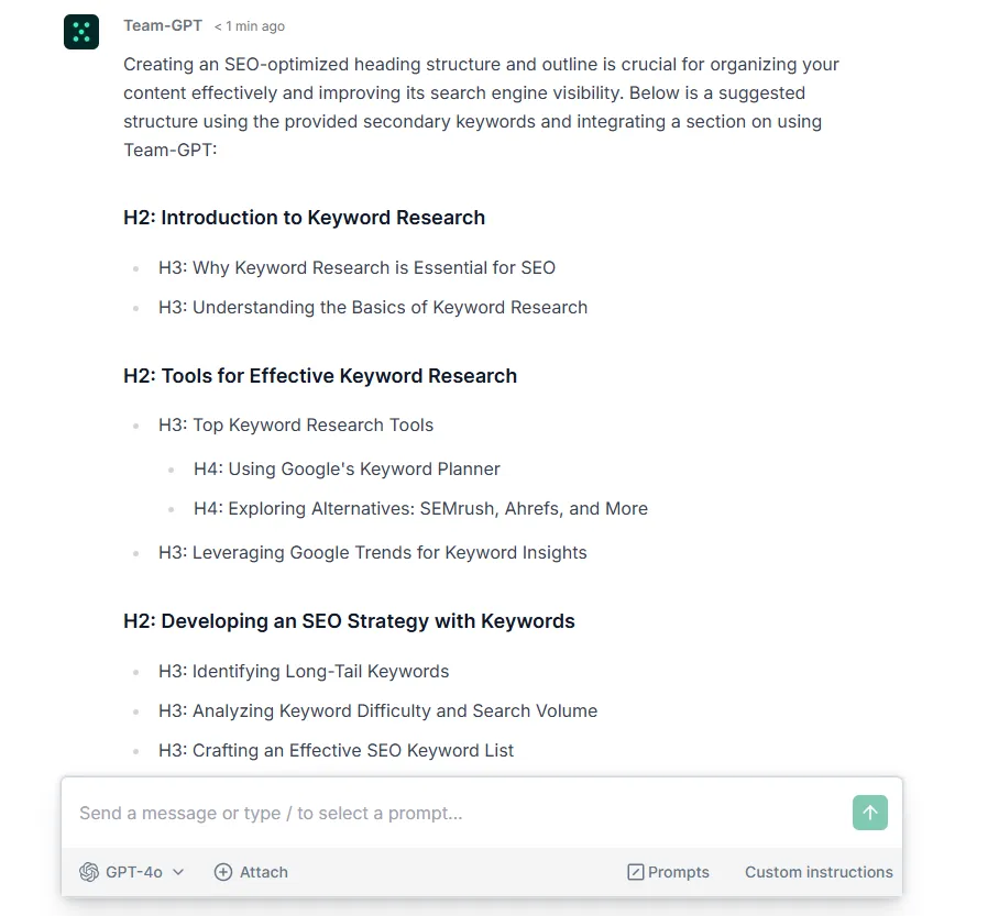 For that, I use Team-GPT’s custom instructions to include our content brief writing style rules so they can be duplicated.