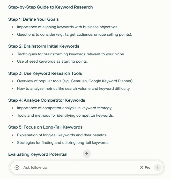 Perplexity, similar to Claude and ChatGPT, lets you generate content briefs from prompts.