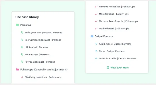 - Prompt library with customizable pre-made prompts for common use cases that help you save time (you can also create and save custom prompts tailored to your organization).
