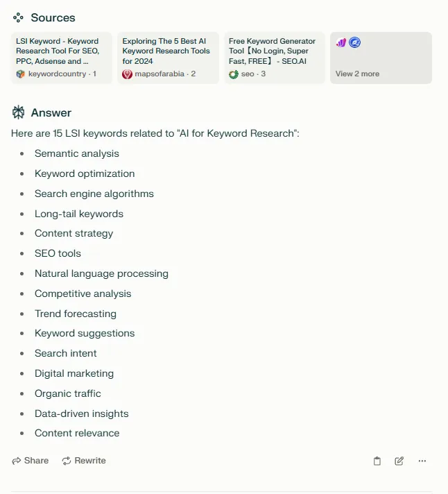 For example, here’s the response from Perplexity that I received about LSI keywords for this article: