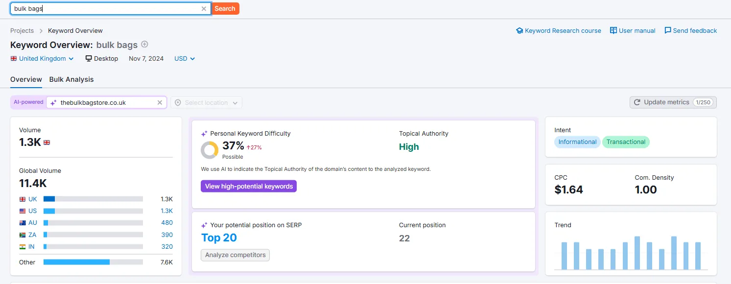 For example, if you type in a keyword that you are interested in Semrush’s keyword explorer and then insert your domain, the tool will calculate your personal keyword difficulty.