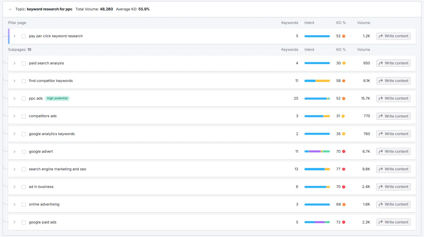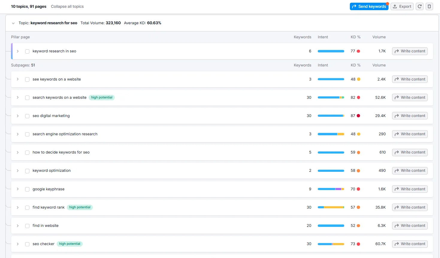 The tool then separates the topics into pillar pages and sub-pages to help me prioritize lower-difficulty topics.