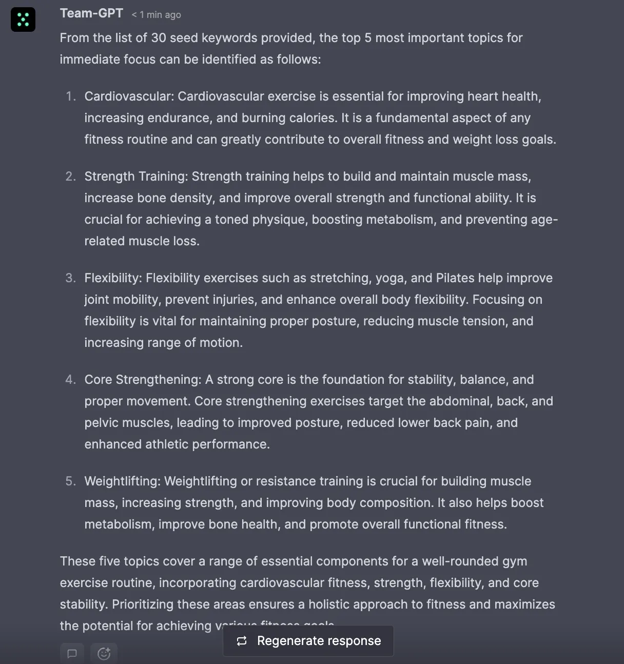 Team-GPT provided me with not only keyword ideas but also explained why my brand should be going after them.