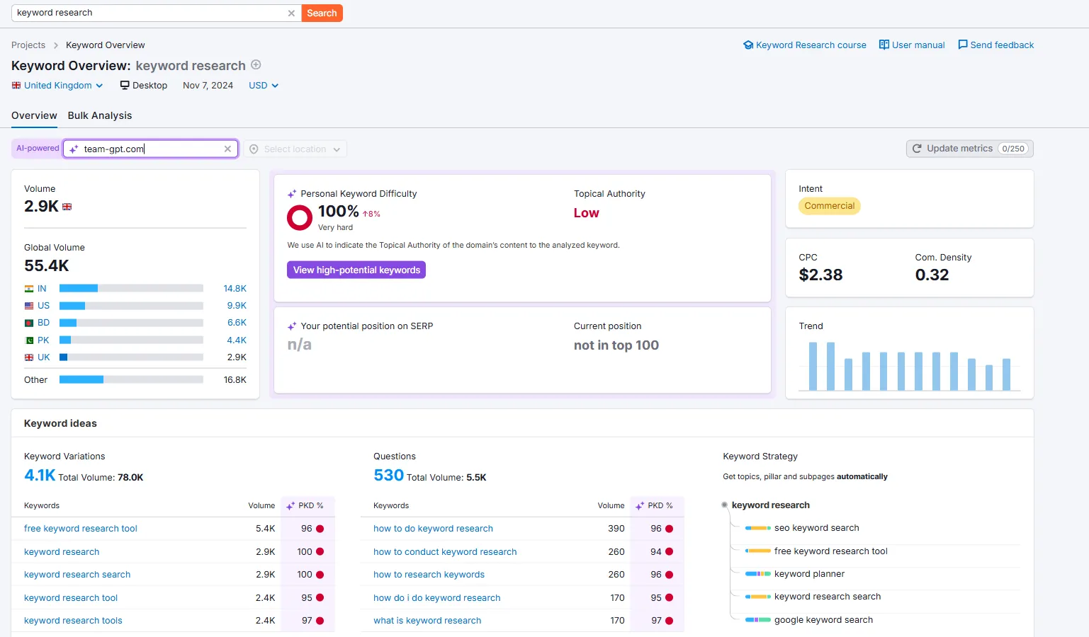 - Due to their ability to analyze large amounts of keyword data, Team-GPT, LowFruits, and Semrush are the best AI tools to kick off your keyword research process.