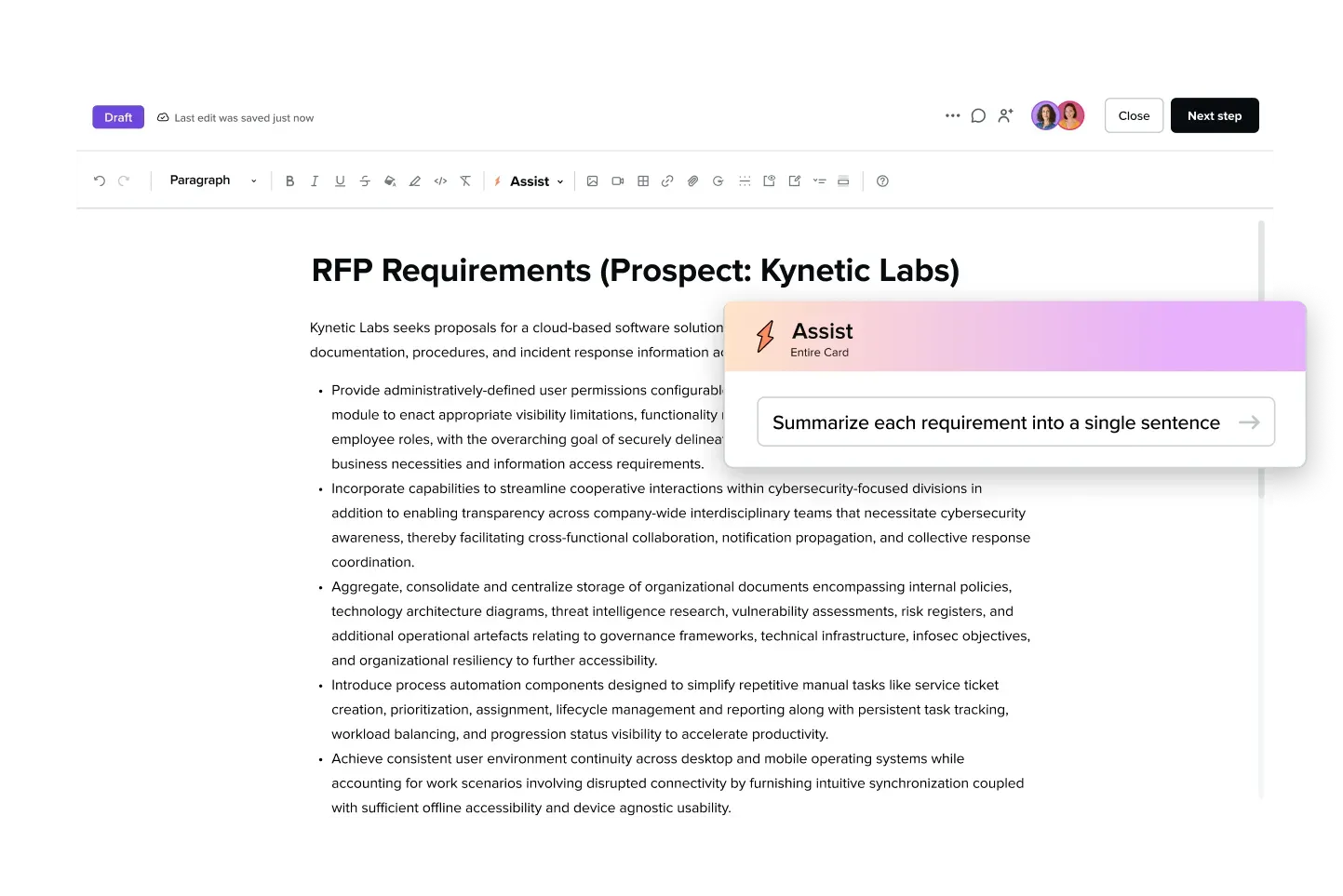 - AI-powered content assistant that is capable of creating, translating, and summarizing content for your sales team.