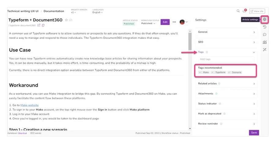 For example, Document360 has an automated tag generation that lets you generate tags with AI for every technical article or resource you produce without having to manually add them.