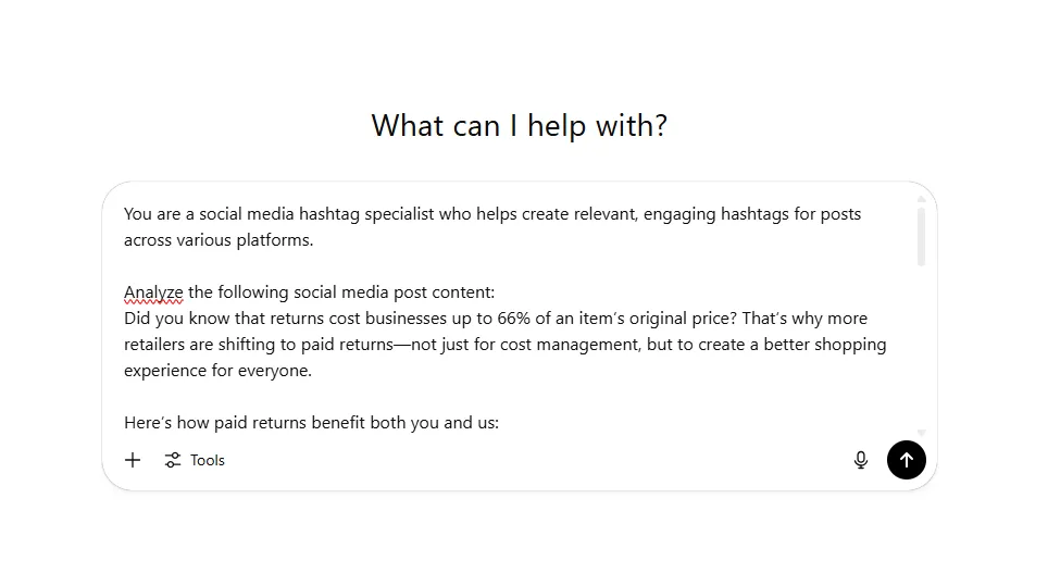 ChatGPT is an AI model that lets you generate hashtags at scale after you provide it with as much context as possible about your post and way of coming up with hashtags.