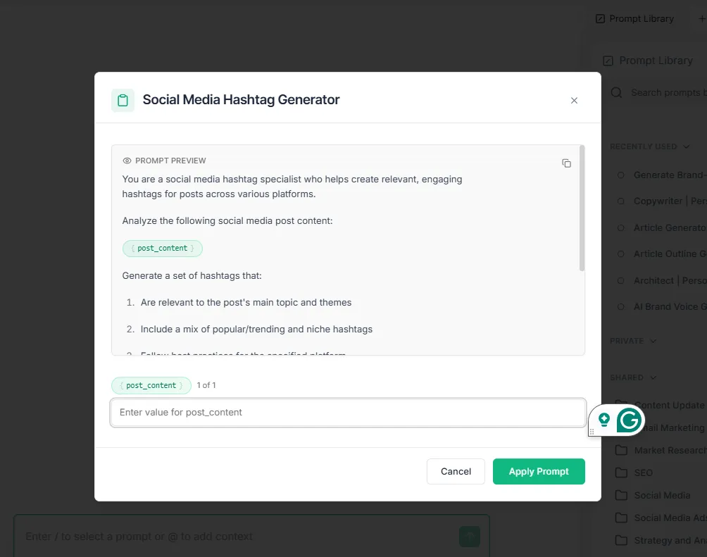 - A prompt builder, which will help you refine your hashtag generation prompt to fit with your content.