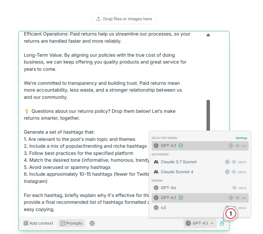 Our collaborative AI platform lets you choose the AI model that you want to use for the output, such as ChatGPT-4.1.