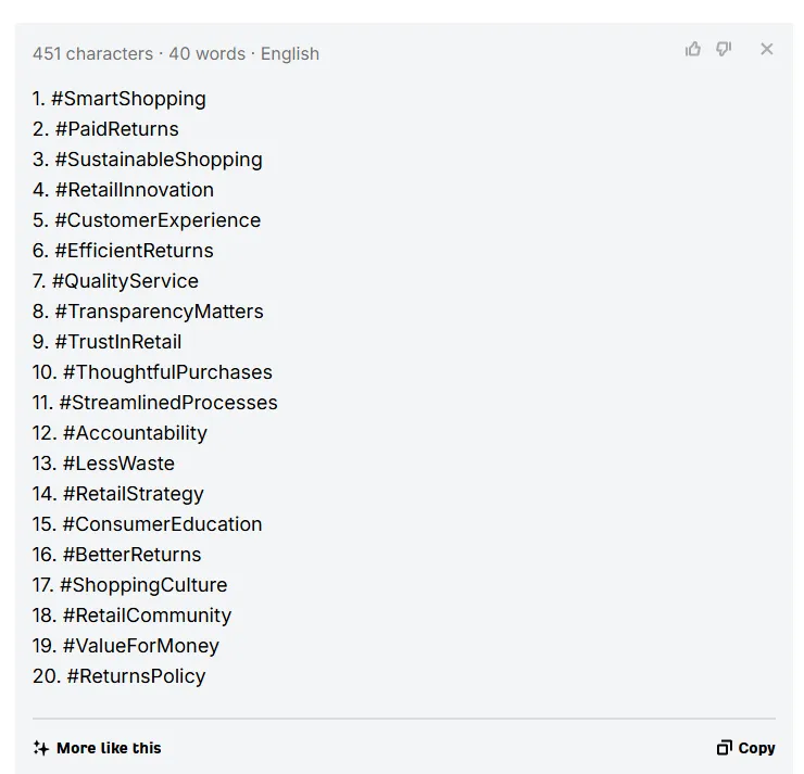I liked how the platform first prioritized the more popular hashtags, such as ‘’#SmarterShopping’’ and then proceeded to go with topic-specific hashtags, such as ‘’#PaidReturns.’’